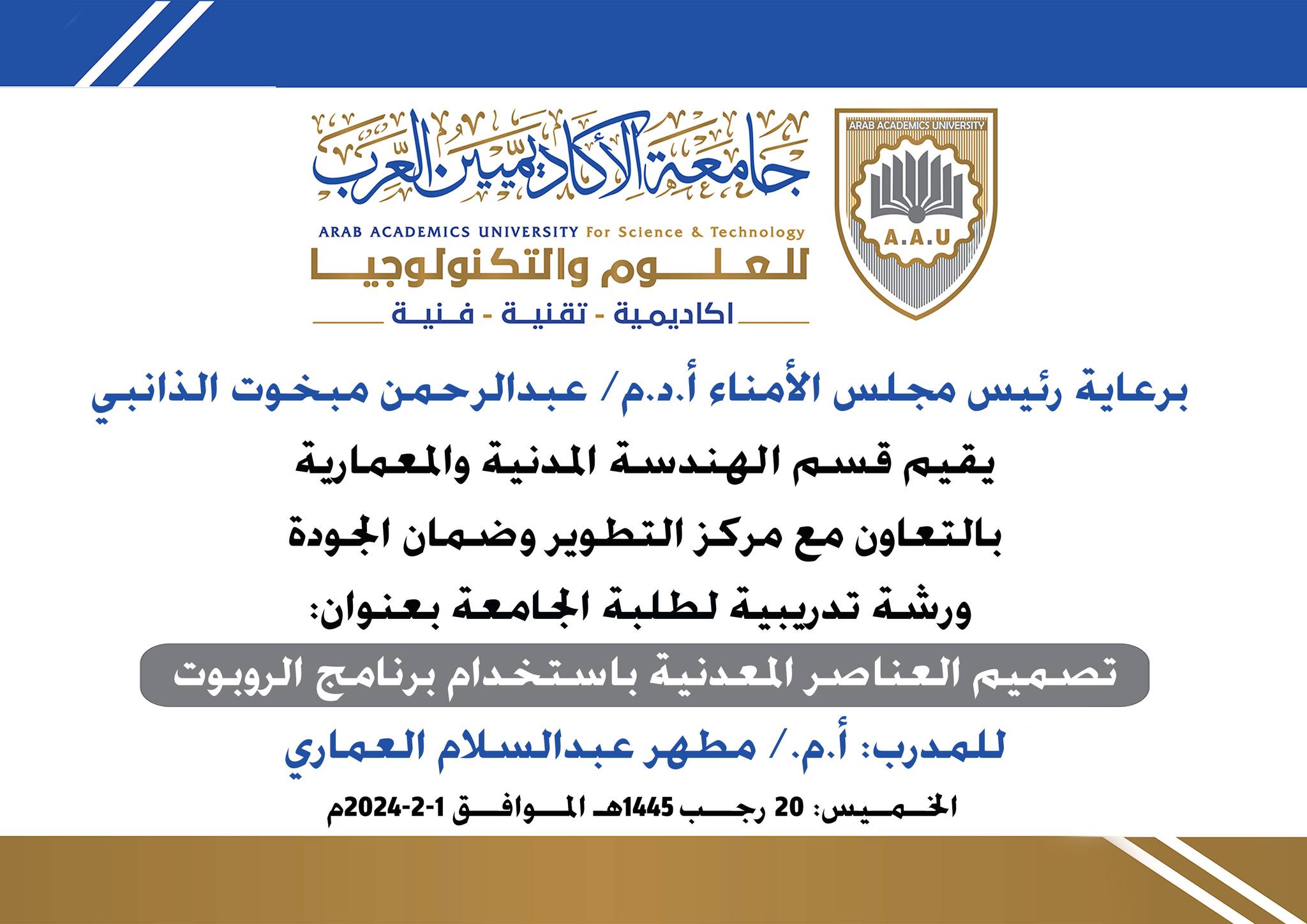 برعاية رئيس مجلس أمناء جامعة الاكاديميين العرب للعلوم والتكنولوجيا أ.د.م/ عبد الرحمن مبخوت الذانبي، اقام قسم الهندسة المدنية والمعمارية بالتعاون مع مركز التطوير وضمان الجودة بالجامعة ورشة تدريبية لطلبة الجامعة بعنوان: " تصميم العناصر المعدنية باستخدام برنامج الروبوت" للمدرب أ.م/ مطهر عبدالسلام العماري.
